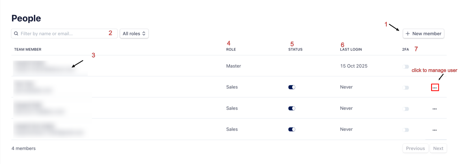 Only Master and users with permission can create or manage other team members