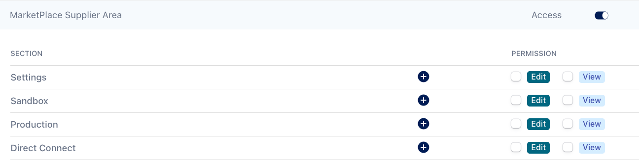 Toggle Access on or off for product areas (e.g. Aggregate, Buyer, TPS Supplier)