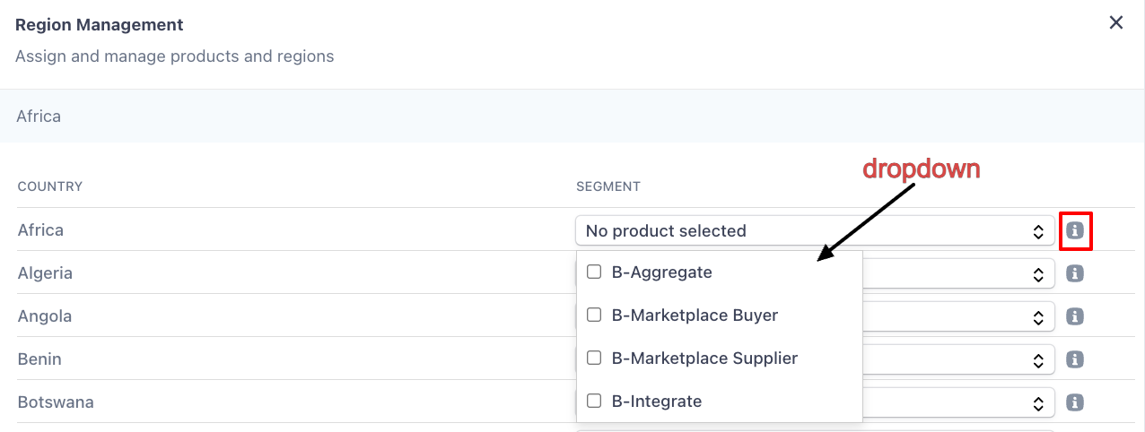 | Region (Sales Role) | Assign product access per country or region (via the Region Management tool) ℹ️ info icon beside the region will show the segment if its assigned. |