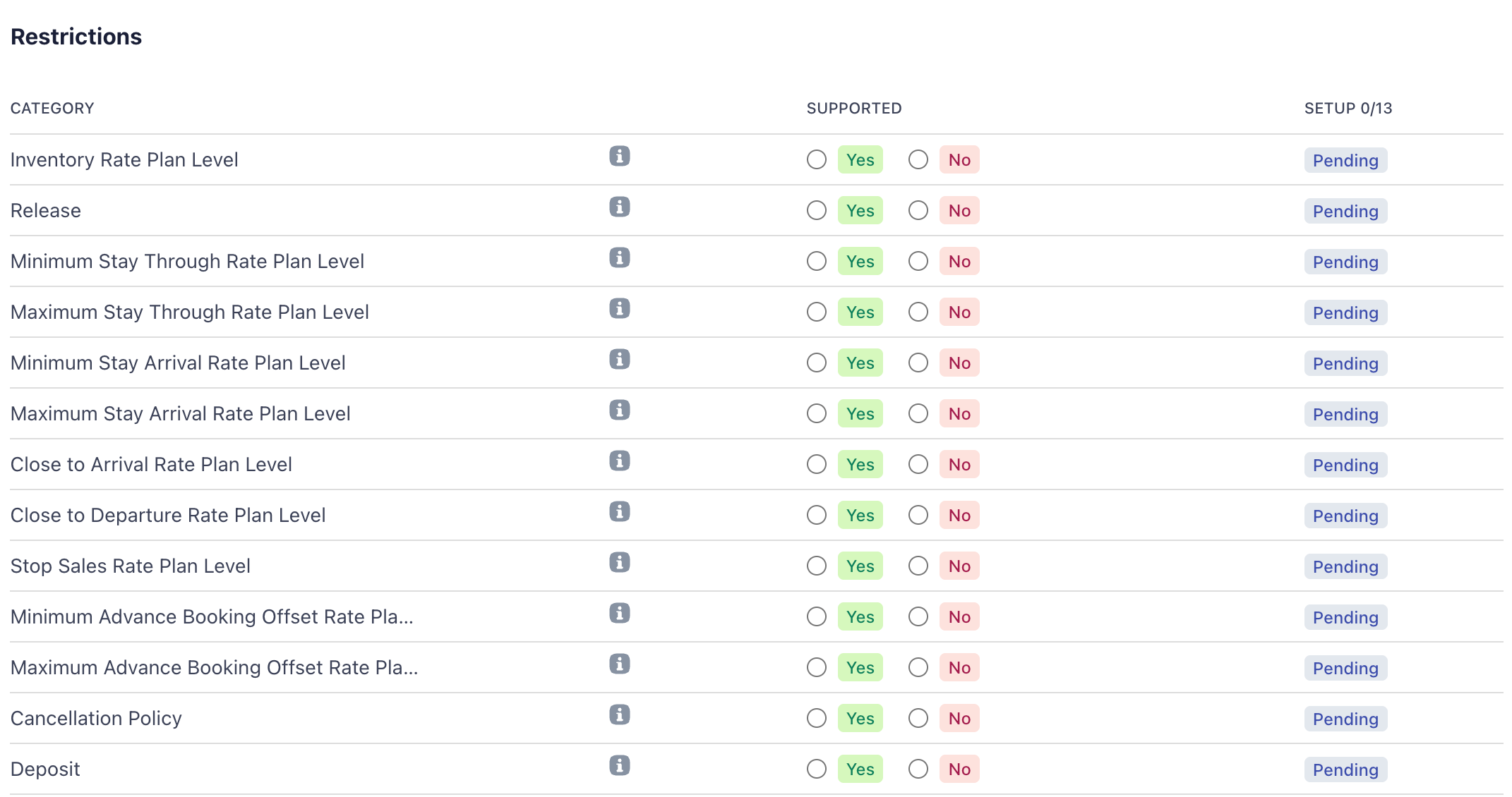 | Status (Pending) | Shows whether the restriction has been configured. “Pending” means a selection (Yes/No) is still required. |