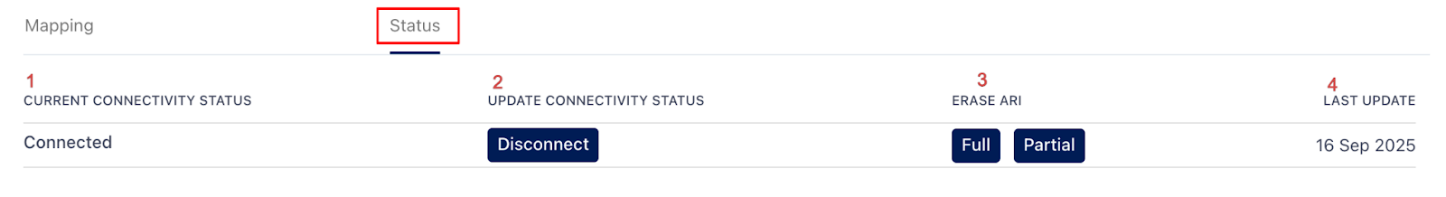The Status tab under Channel Details provides an overview of the current connectivity state of the mapped property and allows basic connection management actions.