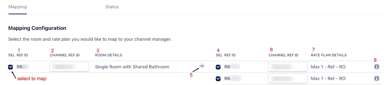 This section displays all rooms and rate plans available for mapping.