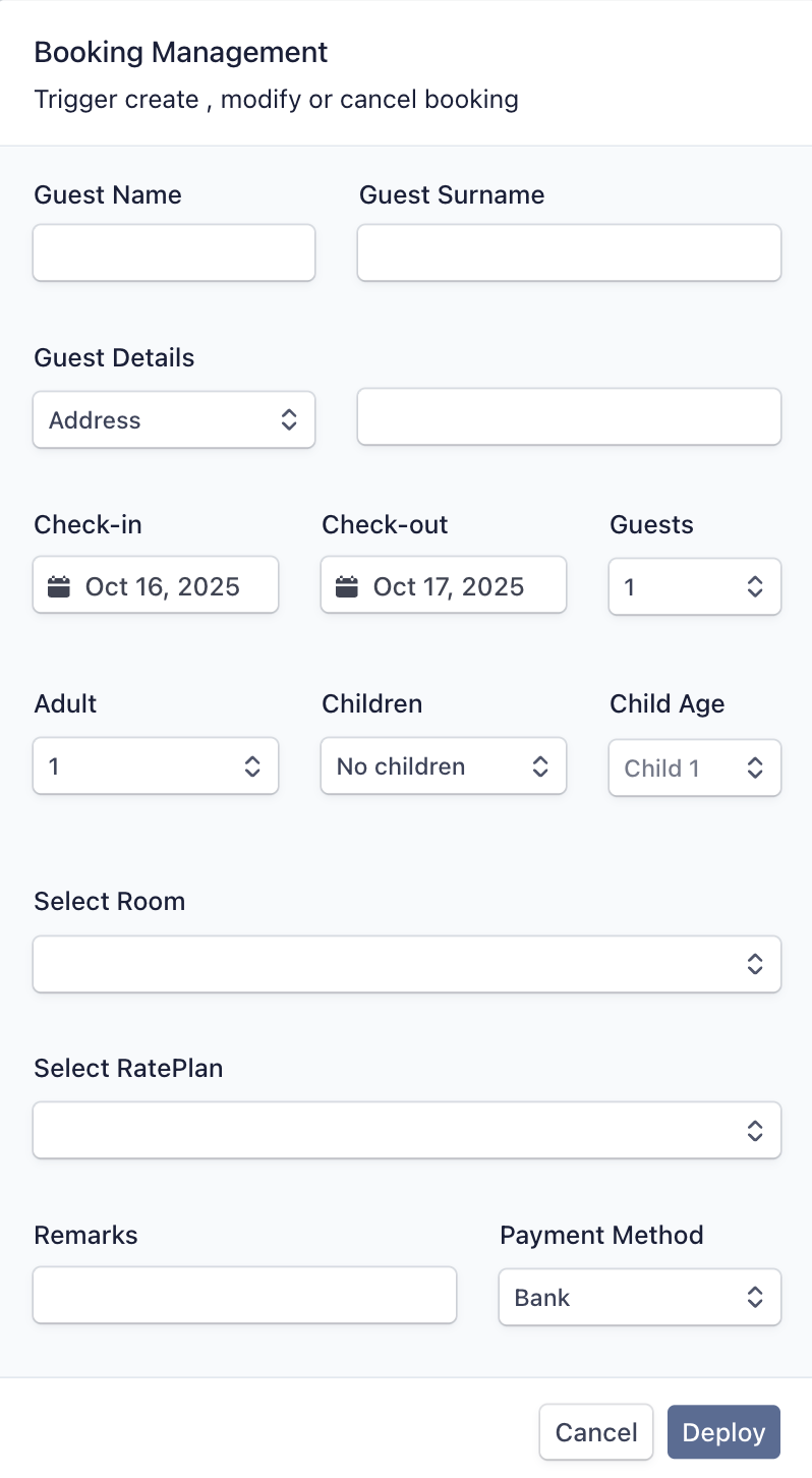 | Select Room | Choose the room (populated from property’s mapped inventory). |