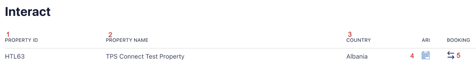 The Interact section allows TPS users to simulate and verify their integration by retrieving ARI data or performing test bookings for a connected property.