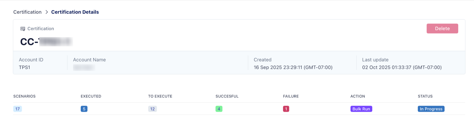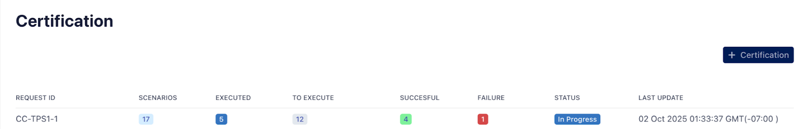 - Clicking on the Status (e.g., In Progress) redirects to the Certification Details page, where you can view a step by step breakdown of all executed test cases.