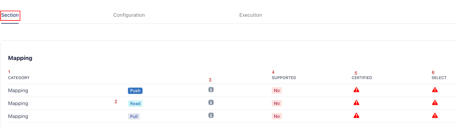 The Section tab within Certification Details lists all functionalities that can be tested and certified for the integration.