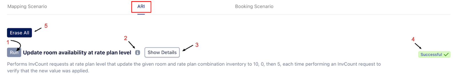 | (2) Scenario Title | Displays the name of the test scenario being executed (e.g., “Update room availability at rate plan level”). |
