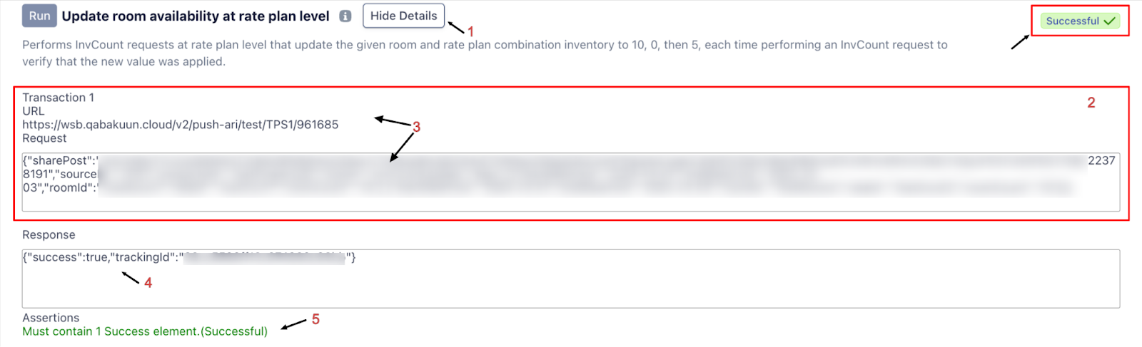 | (3) Show Details | Expands the test logs. Displays the API request payload, system response, and validation result. |