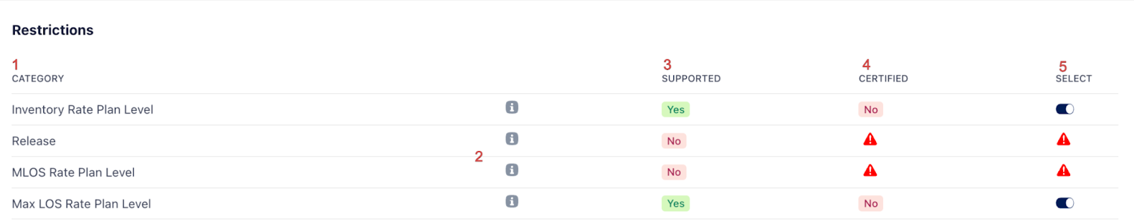 | (1) Category | Lists the restriction type being certified (e.g., Inventory Rate Plan Level, Release, Minimum LOS, etc.). |