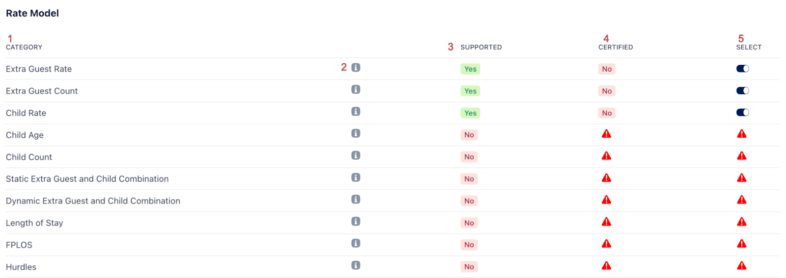 | (5) Select | Enables the rate feature to be included in certification. If unavailable, a red warning icon appears and selection is disabled |
