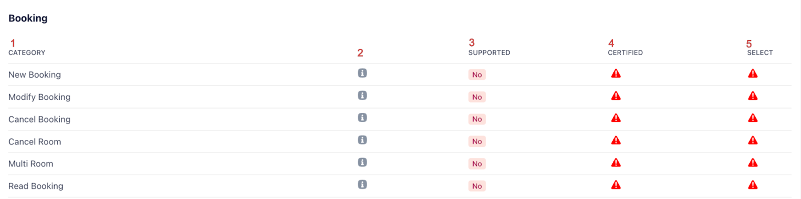 | (1) Category | Lists the booking operation available for certification, such as New Booking, Modify Booking, Cancel Booking, Cancel Room, or Multi Room. |