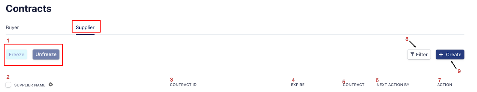 | Click to filter contracts by supplier name, ID, contract type, or expiration status for quicker navigation. |