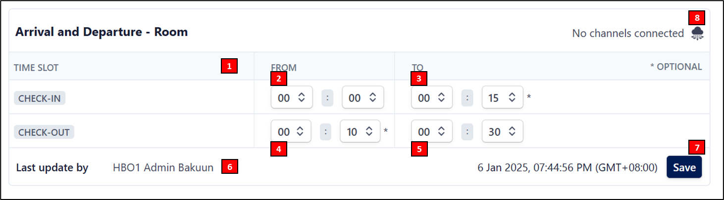 - From / To → Define the earliest and latest times guests can check in or check out within each time slot.