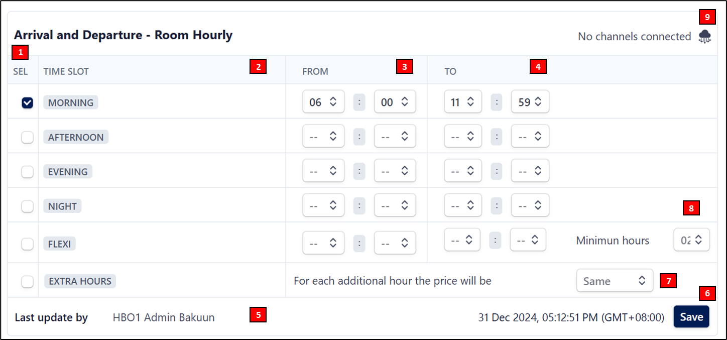| (2) Time Slots | Morning, Afternoon, Evening, Night, Flexi | Select the available time slot for hourly bookings. Extra Hours can also be added if guests extend their stay. |