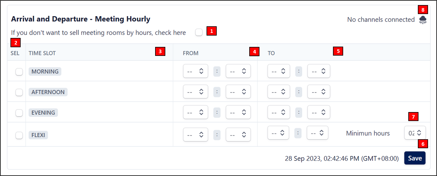 In the Arrival and Departure – Meeting Hourly section, you can configure the time windows for meeting rooms that can be booked by the hour at your property.