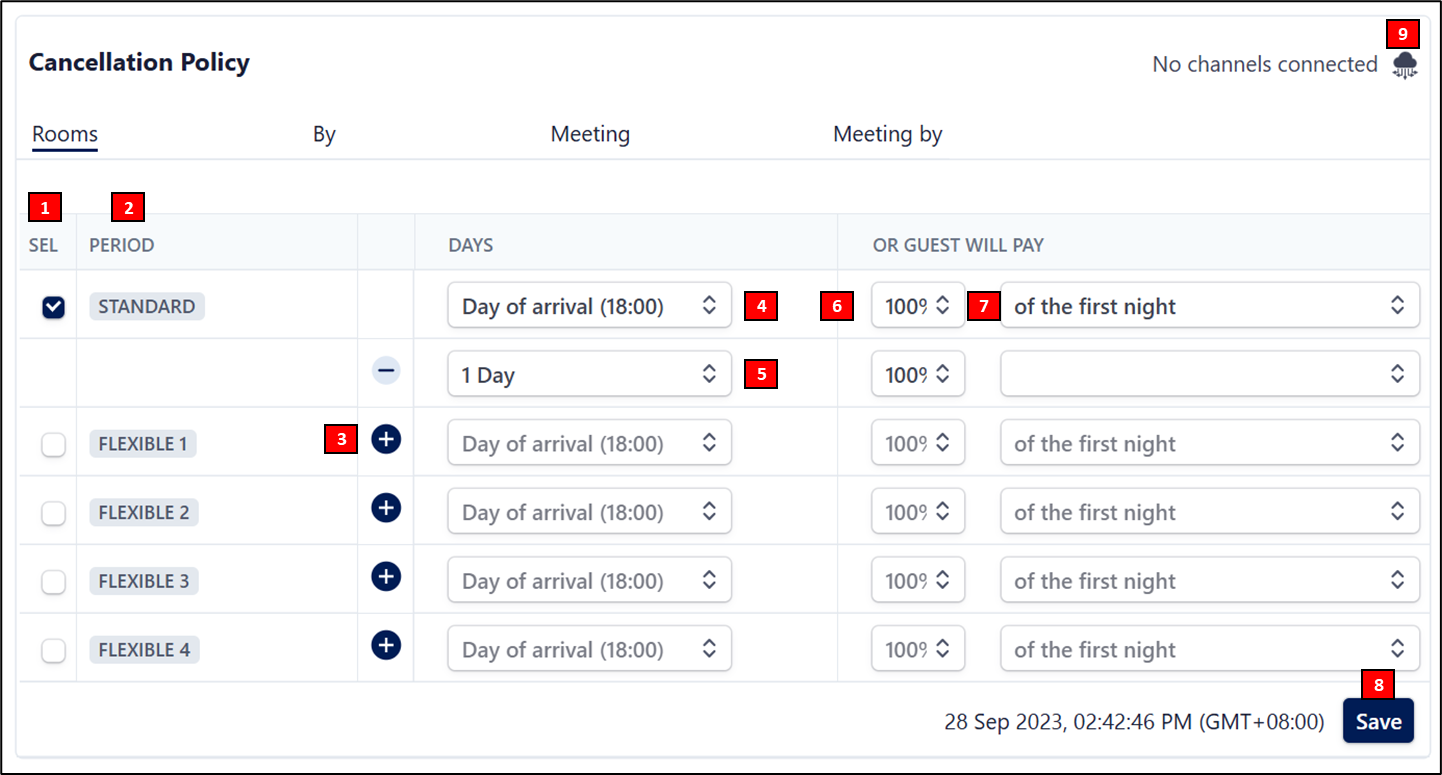 | (2) Period | Standard, Flexible 1–4 | Choose the cancellation policy type: Standard, or one of the Flexible options. |