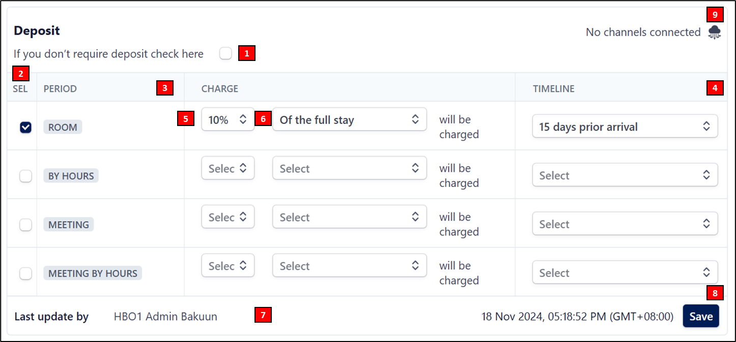 In the Deposit section, you can specify whether a deposit is required from guests when booking a room, meeting room, or an hourly room/meeting room.