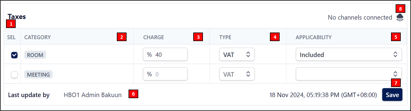 | (2) Category | Room / By Hours | Select the booking type that the tax applies to (Room or By Hours). |