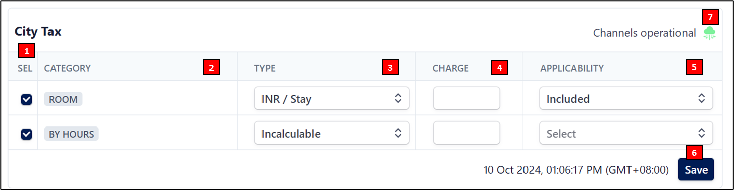 | (1) Selector | N/A | Select the applicable row for rooms where City Tax will be charged. |