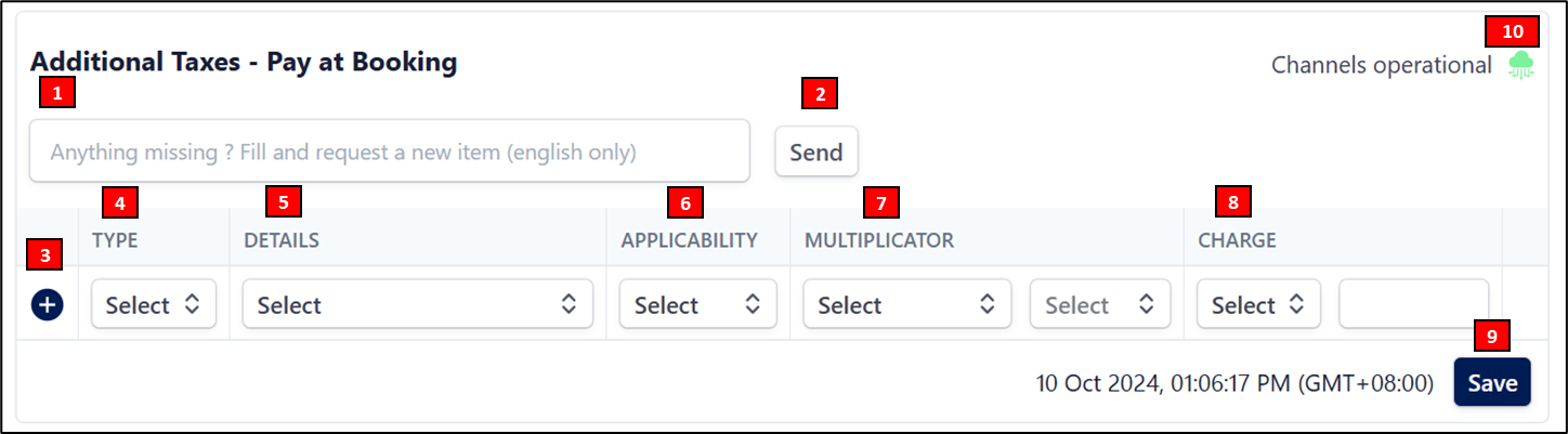 In the Additional Taxes – Pay at Booking section, you can define additional taxes or fees that will be collected at the time of booking.