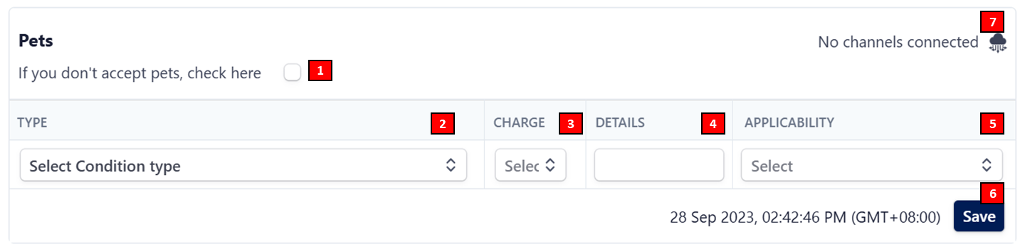 | (2) Type | - All pets allowed free of charge- Only small pets allowed free of charge- All pets allowed with extra charge- Only small pets allowed with extra charge | Select the types of pets allowed and whether an extra charge applies. |
