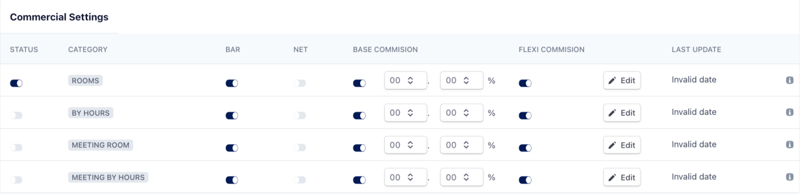 The Commercial Settings section allows suppliers to configure commission structures and availability status per booking category within the B-Marketplace. Unlike the “View Only” setup in other areas, this section is fully editable, empowering users to manage their commercial terms directly.