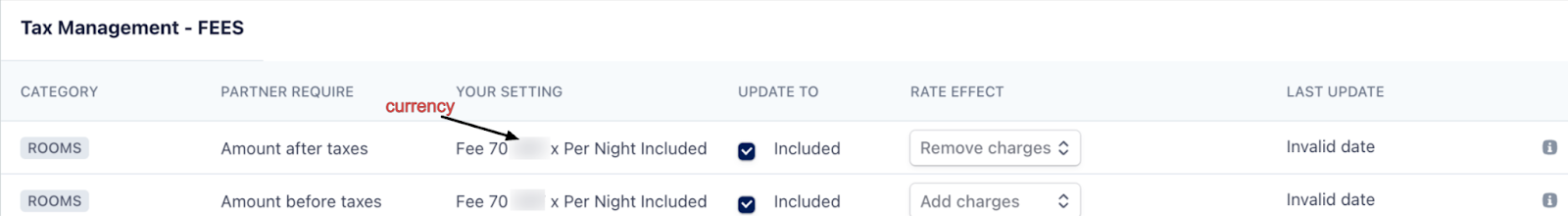 | Partner Require | Displays the row for Amount after taxes and Amount before taxes setup. This helps you with your property’s configuration if it differs from what the partner expects to receive. |