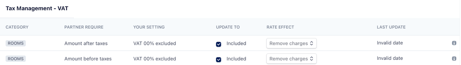 This section displays how Value Added Tax (VAT) is applied to bookings for Rooms and Meeting Rooms. It ensures that your VAT rules are correctly aligned with partner requirements.