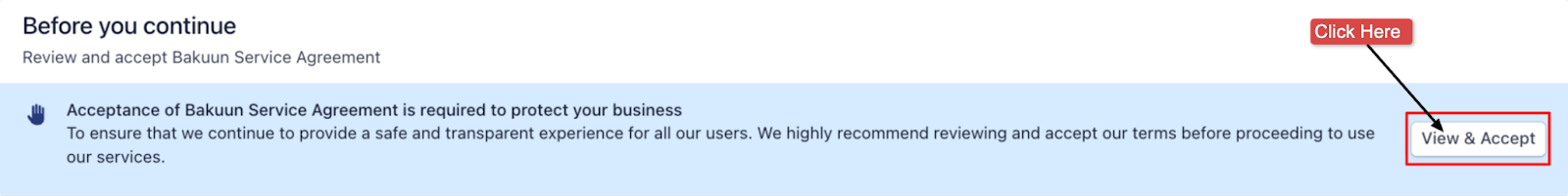 To protect your business and maintain a safe and transparent environment for all users, you must accept the Bakuun Service Agreement.