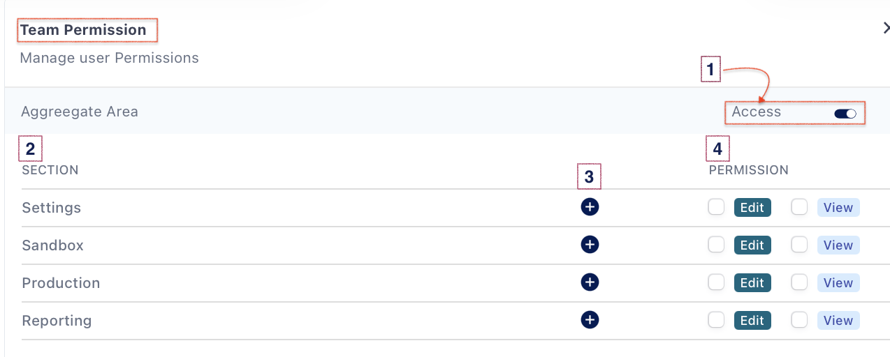 | Permission | Manage detailed access by product area and section (e.g. View/Edit rights) |