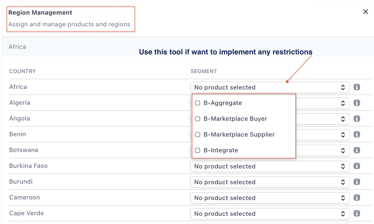| Segment Dropdown | Click the dropdown next to each country to assign one or more product access levels: