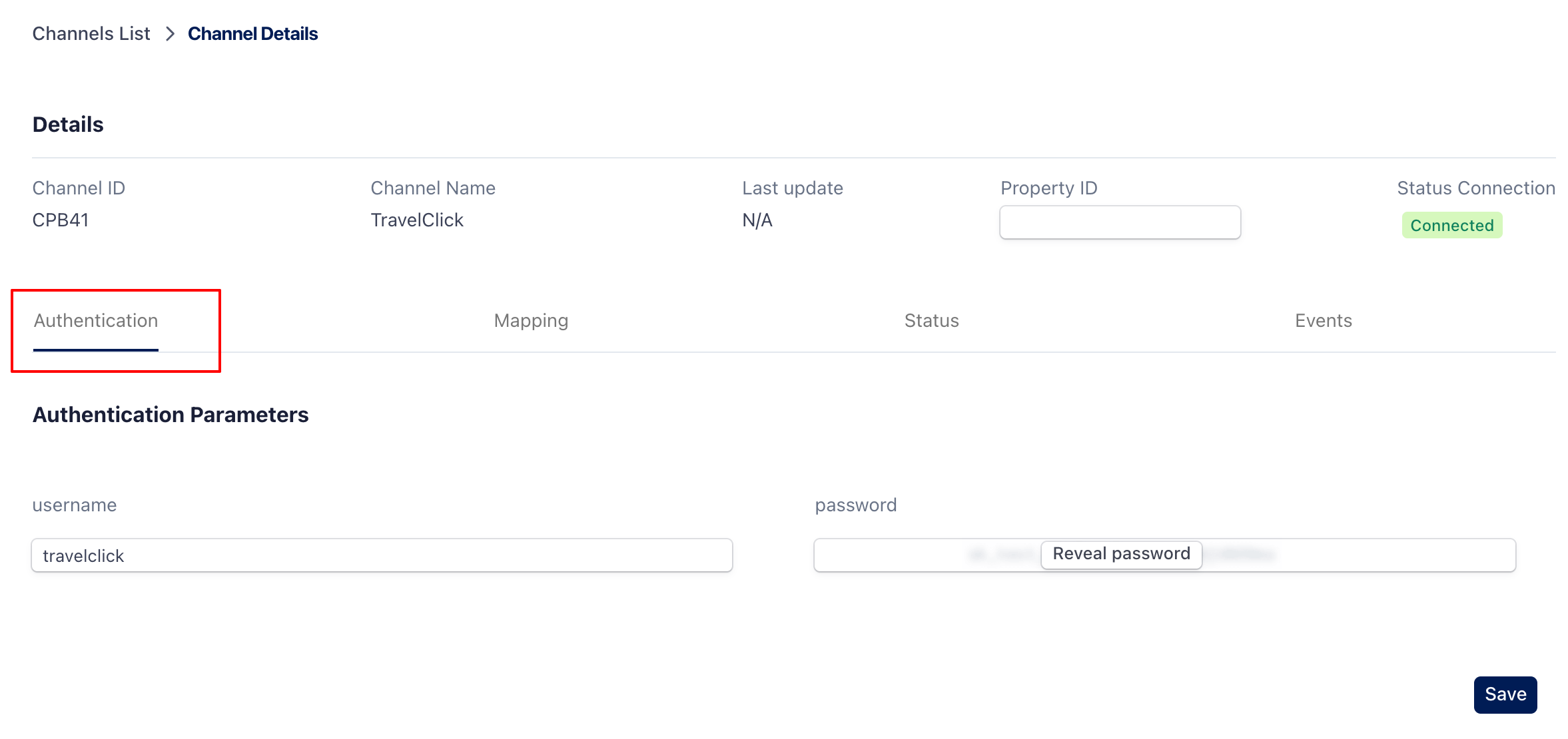 This section displays the credentials required by the Channel Manager, if applicable. You will only see this tab if credentials are required. This section is for reference only. Click SAVE or MAPPING to continue.