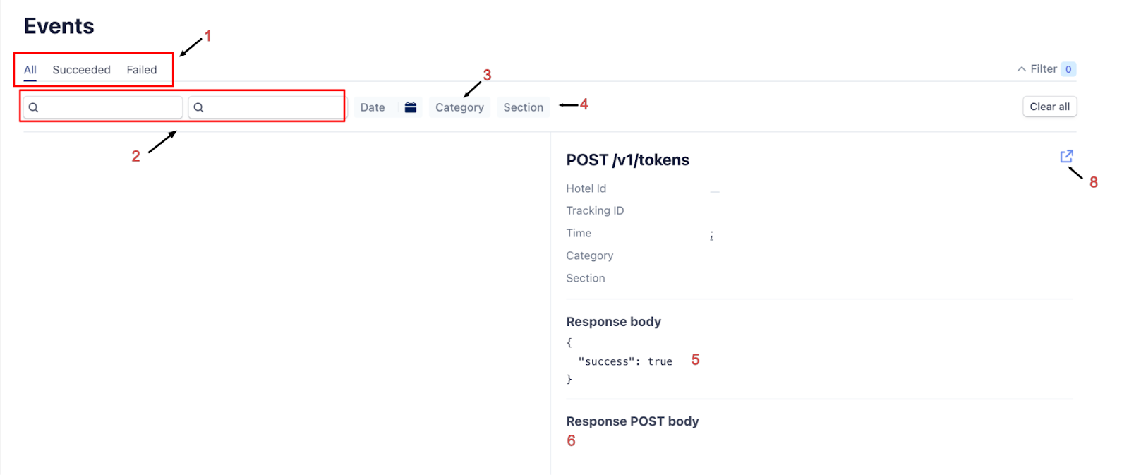 | (2) Search Bars | Search events using keywords, Tracking ID, or dates. |