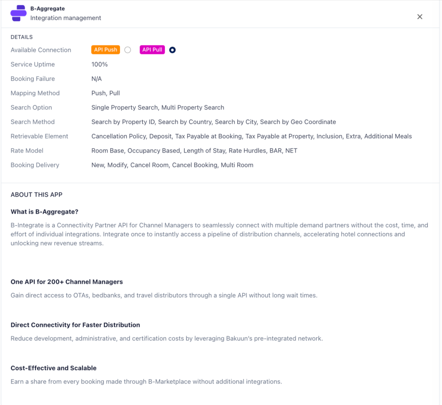 | Mapping / Search / Rate Model | Shows supported technical capabilities of the integration. |