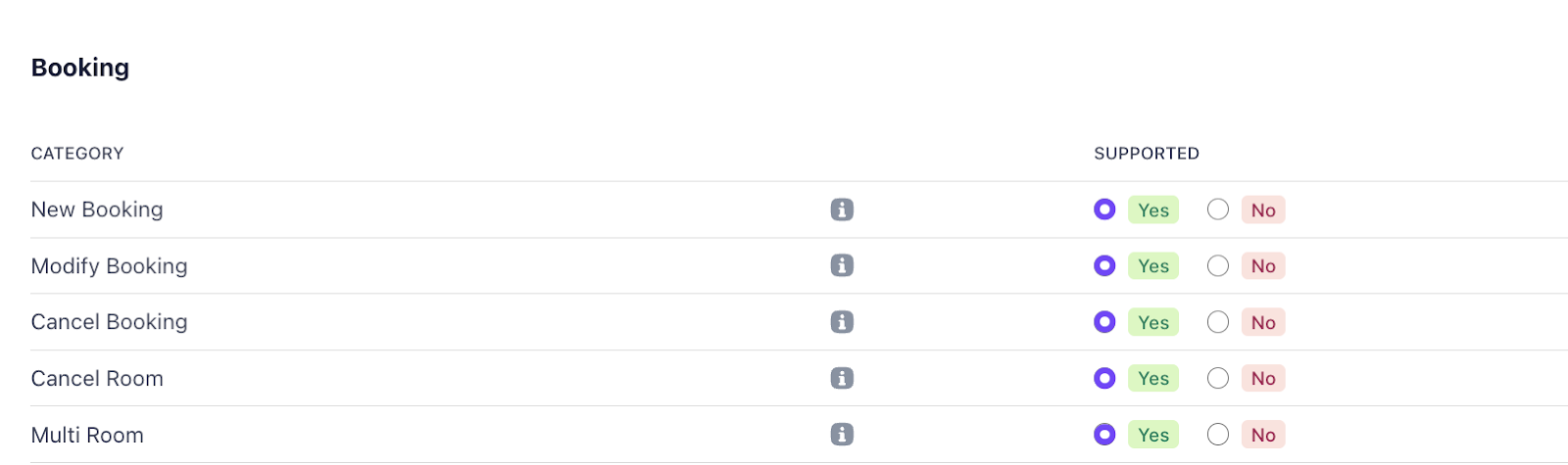 | Multi Room | Indicates support for bookings that include more than one room (i.e., group or family bookings made in a single transaction). |