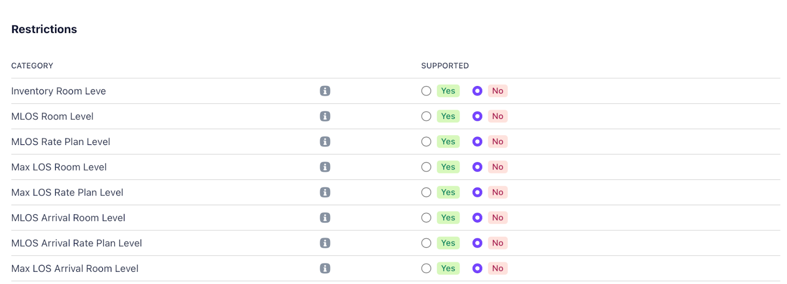 This section defines the specific restriction rules your system supports. Each item reflects whether your system can handle and process that restriction when syncing with Bakuun. These settings are important for ensuring consistency across rate plans, availability, and booking rules.