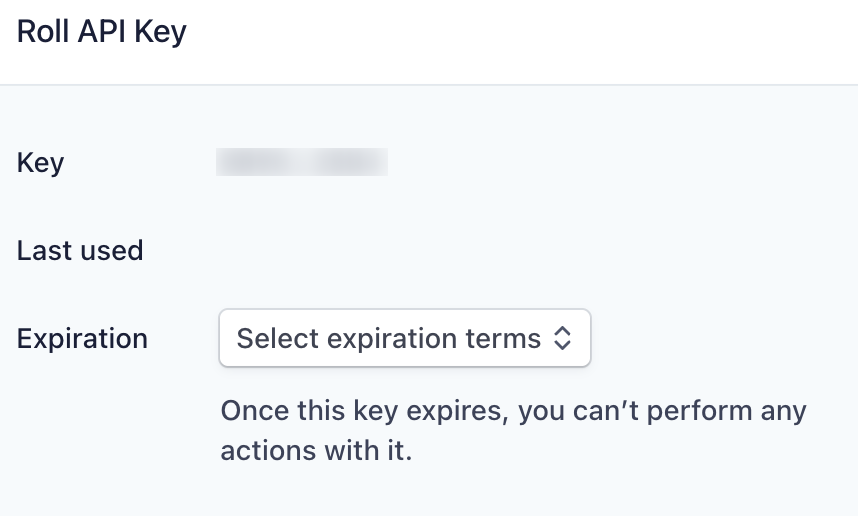 This opens the Roll API Key modal, used when a key rotation is required (e.g., for security reasons)