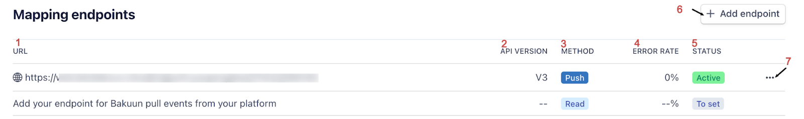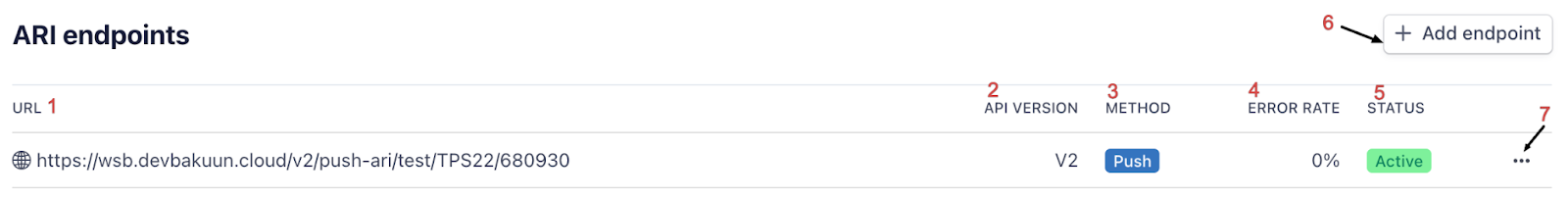 Note: Each endpoint shows its method type (Push/Read), API version, error rate, and status so you can monitor integration health at a glance.