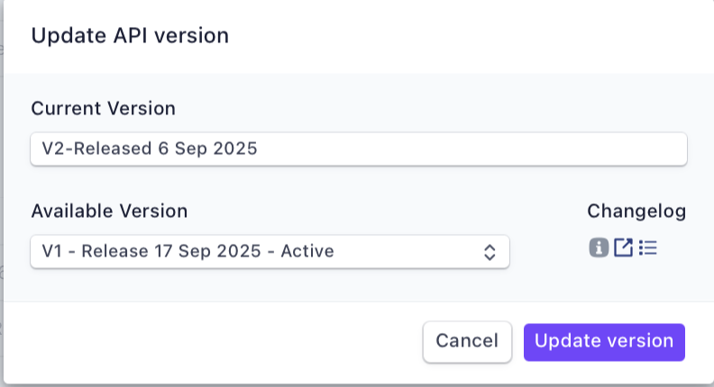 Available Version: Dropdown with older or newer versions available (e.g., V1 – Released 17 Sept 2025 - Active).