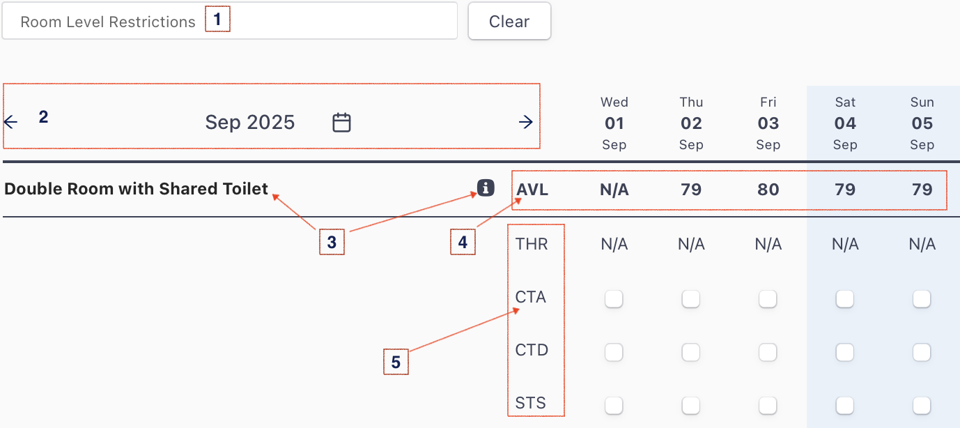 | Confirms you’re in the “Room Level Restrictions” view. This ensures you’re seeing restrictions applied to the room itself (not to individual rate plans). |