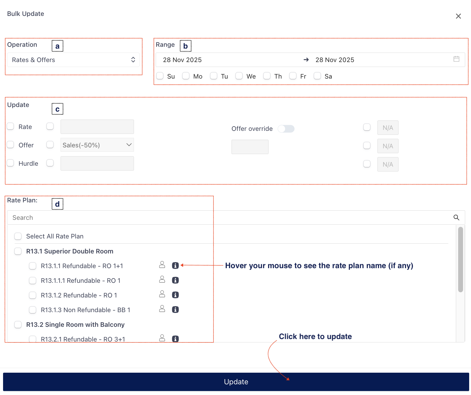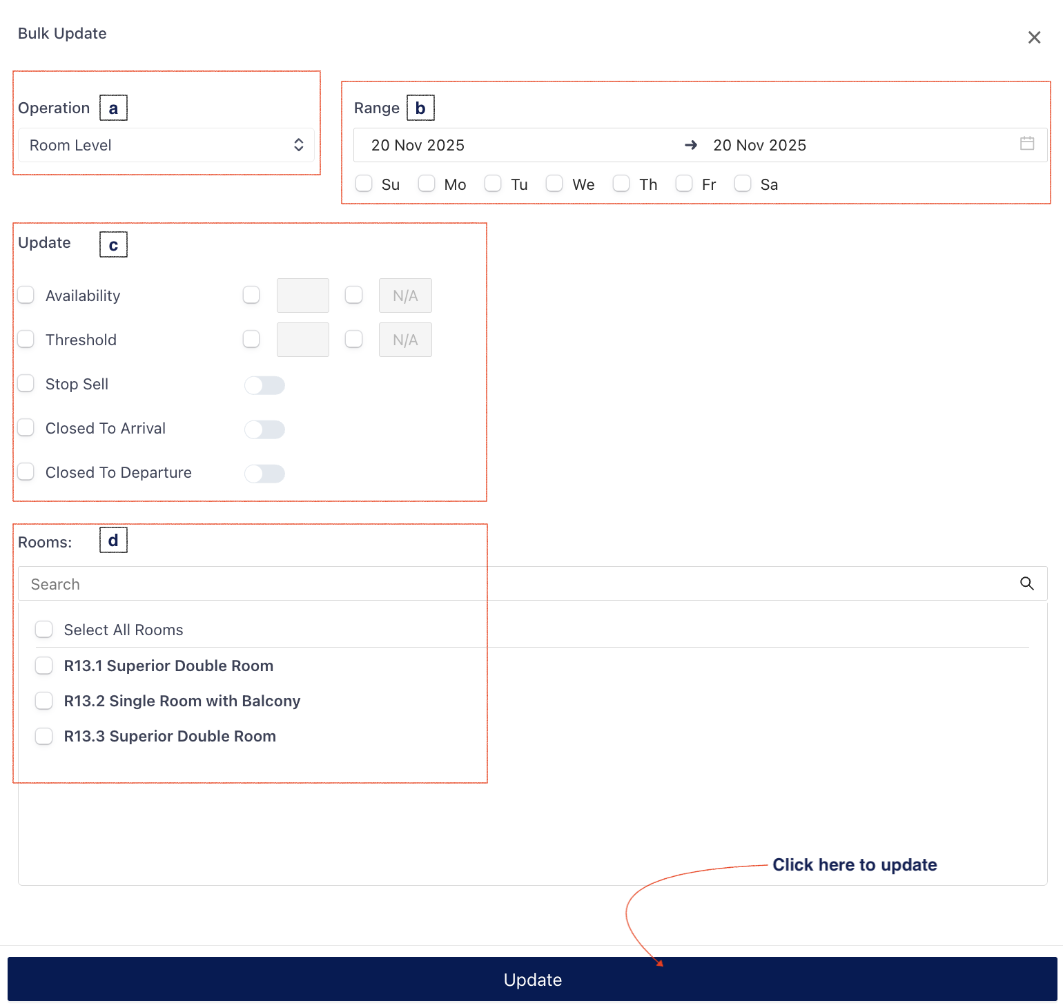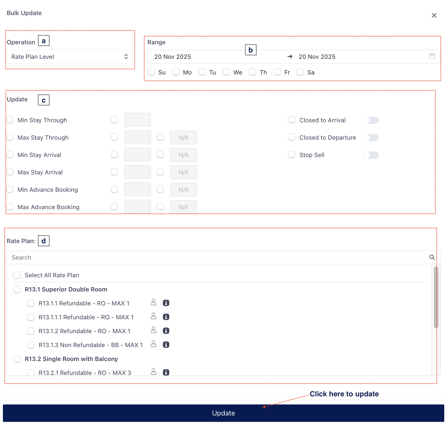 To help streamline your operations, the Bulk Update function allows you to make mass changes across multiple Rate Plans for selected date ranges. You can apply updates to: