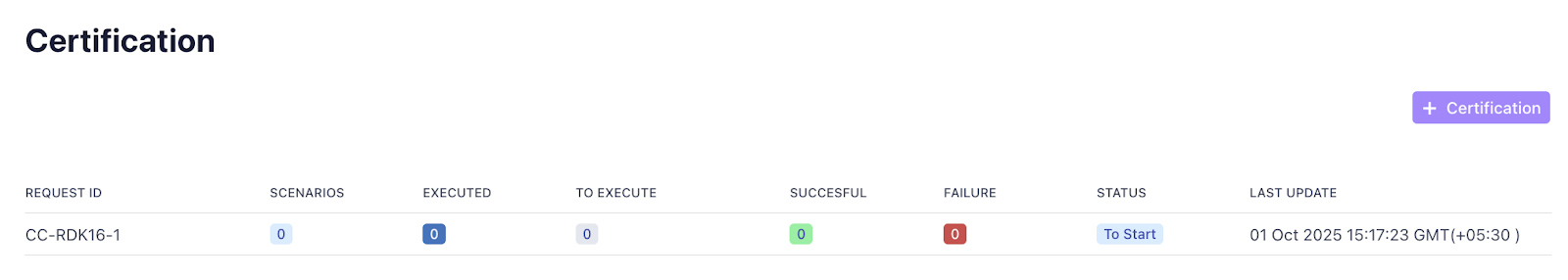 | Request ID | Unique ID assigned to each certification process |