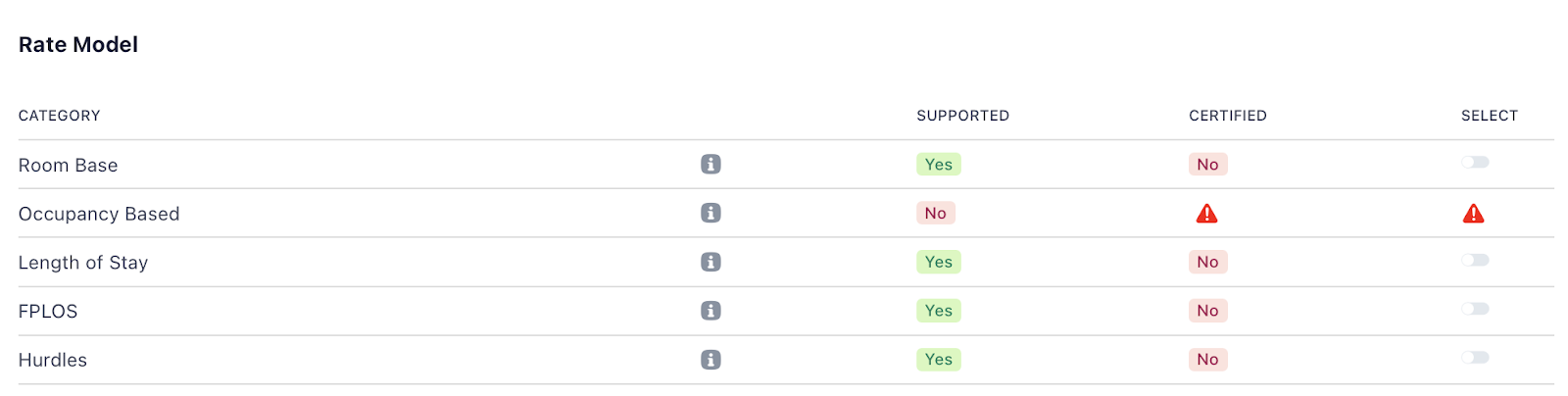 | Select | This shows whether the rate model type is enabled for certification. A toggle appears if it can be selected. If not available, a red 🔺 icon is shown. |