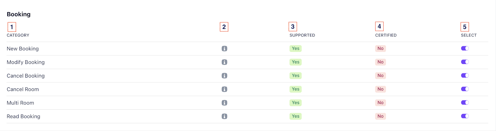 This tab is organised into multiple subcategories, such as Mapping and Booking → each representing a critical function of the integration. It serves as a reference point for both technical teams and platform reviewers to see what’s implemented, what’s pending, and what’s unsupported.