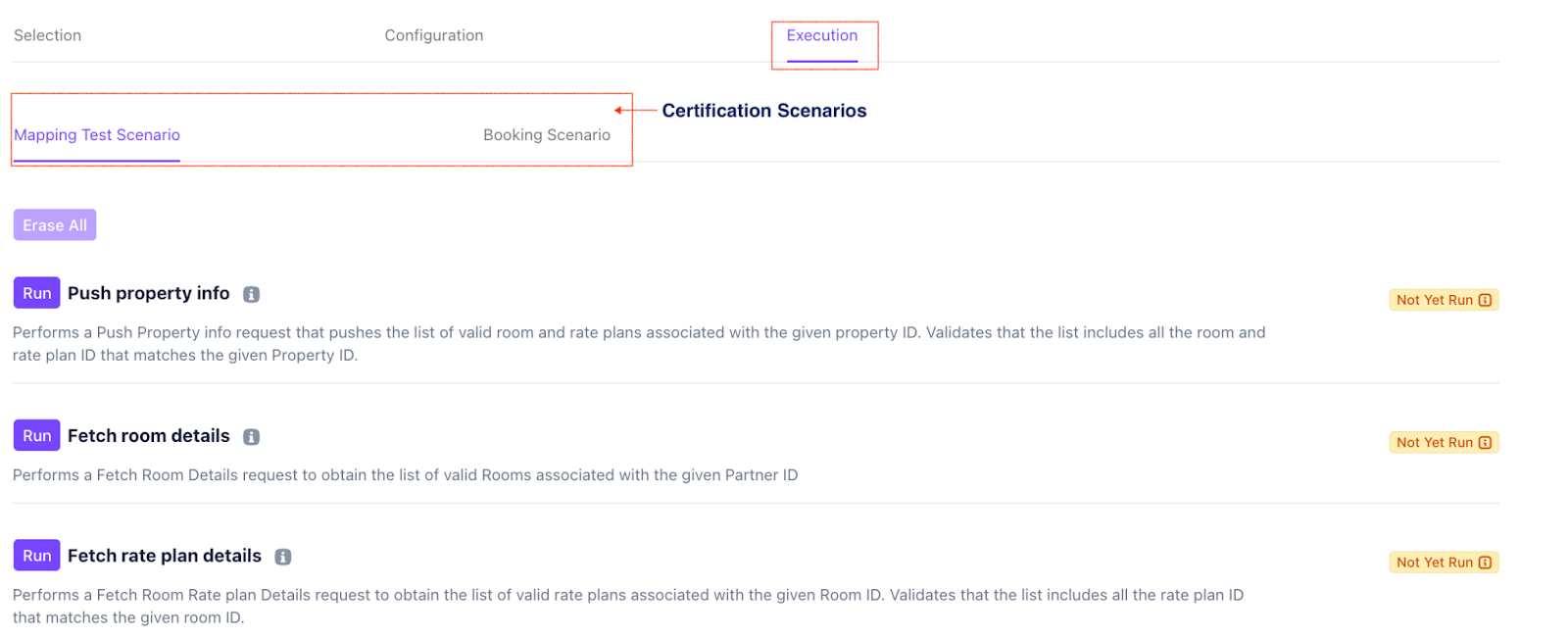 The Execution tab is where you run the required test scenarios to validate your integration with Bakuun’s platform. This process ensures that all data related to your property, rooms, and rate plans is correctly pushed and pulled through the API.