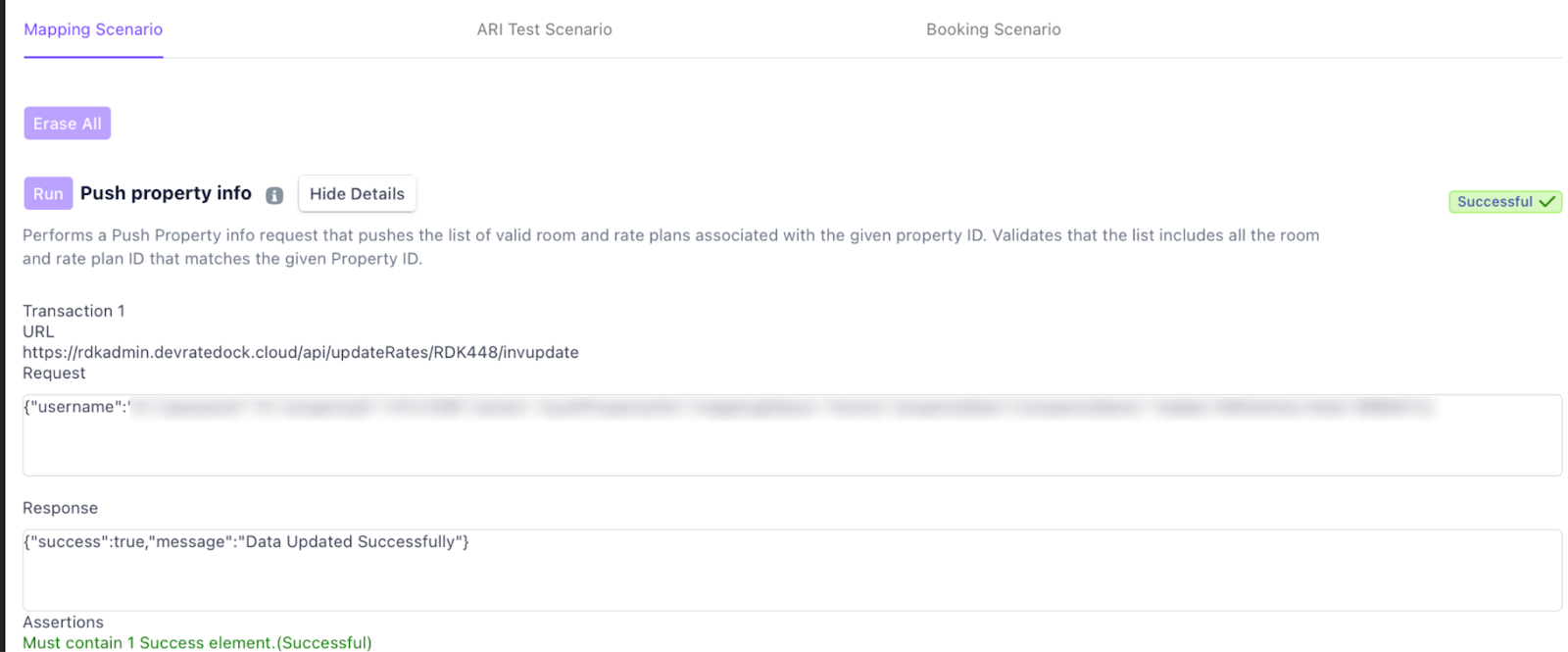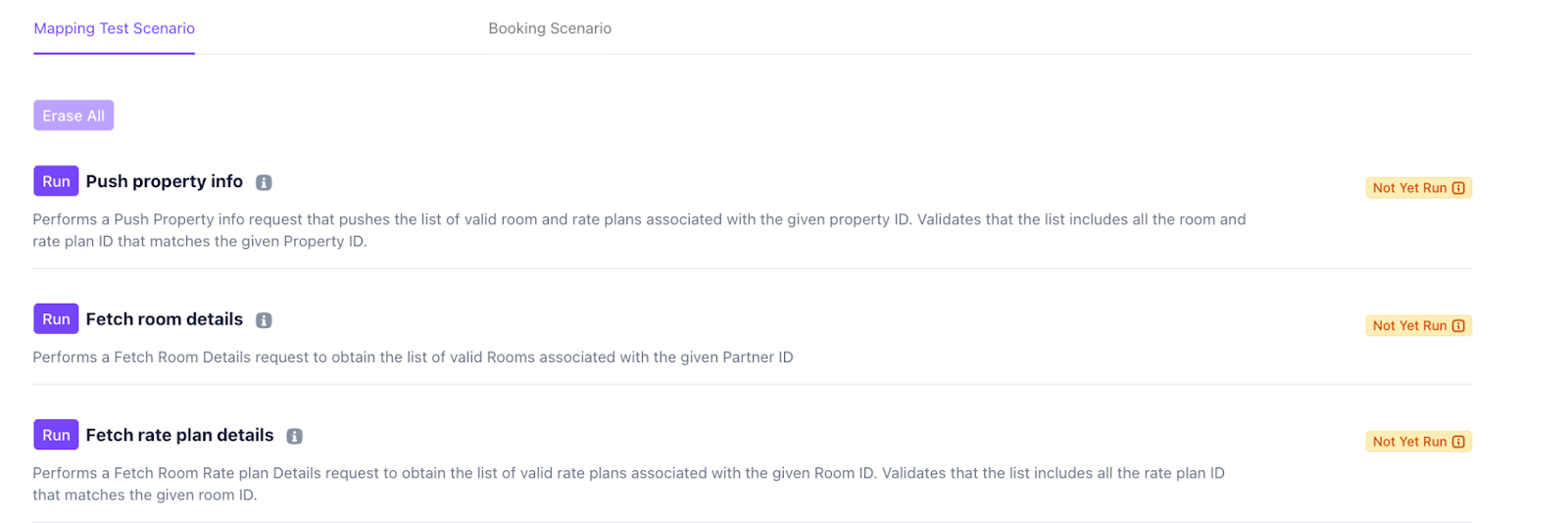 | Push Property Info | Sends a Push Property Info request to validate that the correct Room and Rate Plan IDs are linked to the Property ID. | Not Yet Run / Success / Failed |