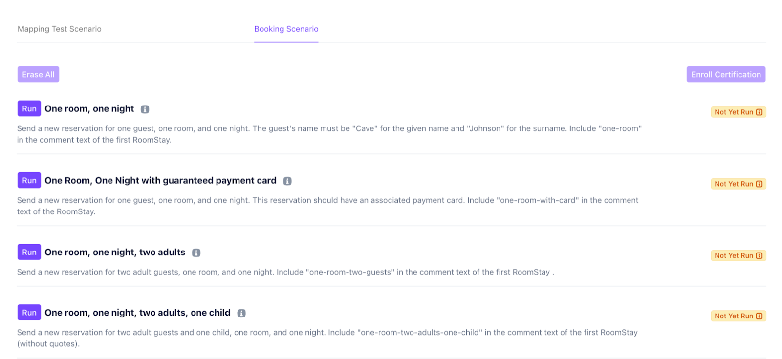 💡Tip: The test result for each scenario will appear on the right (e.g. Not Yet Run, Passed, or Failed). All scenarios must pass before proceeding to booking tests.