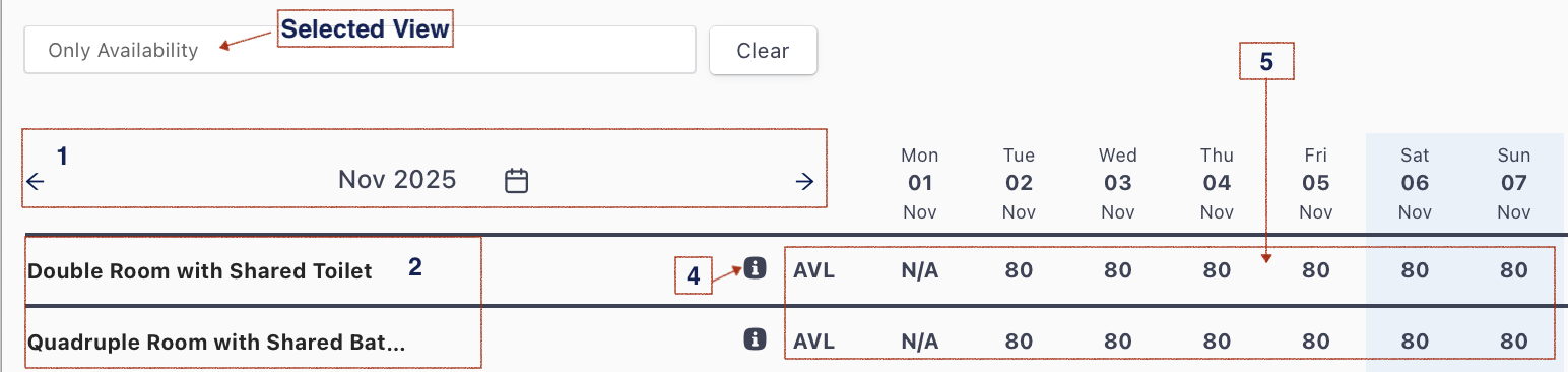 | Only Availability | Displays only the property’s room availability (inventory) for each date. This is useful when reviewing room allotments or inventory pushes, especially for properties using dynamic availability updates via API. |