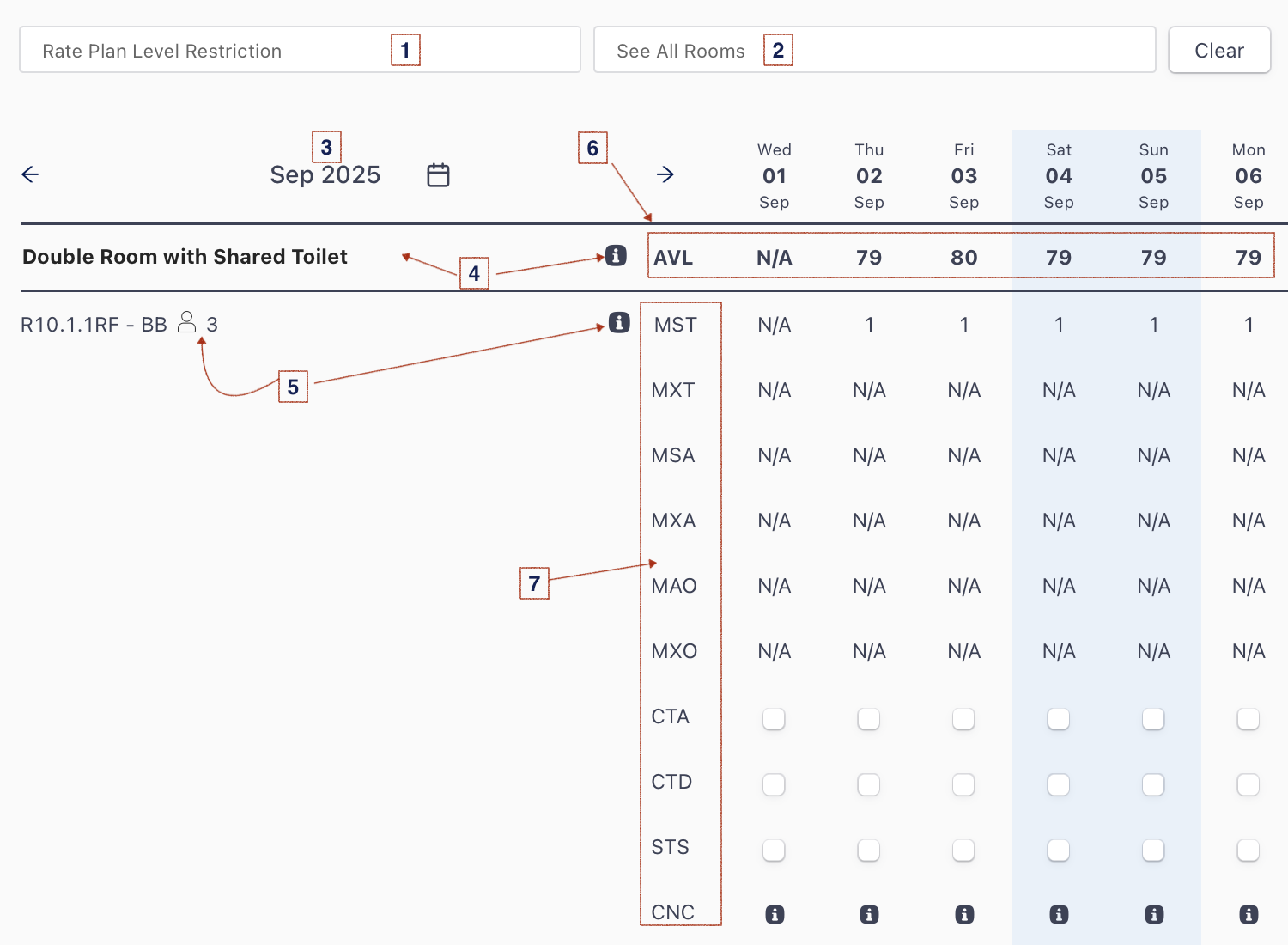 This view allows you to validate restrictions that are applied directly at the room level (not per rate plan). It’s used to control availability for specific room types, regardless of which rate plan they are attached to.