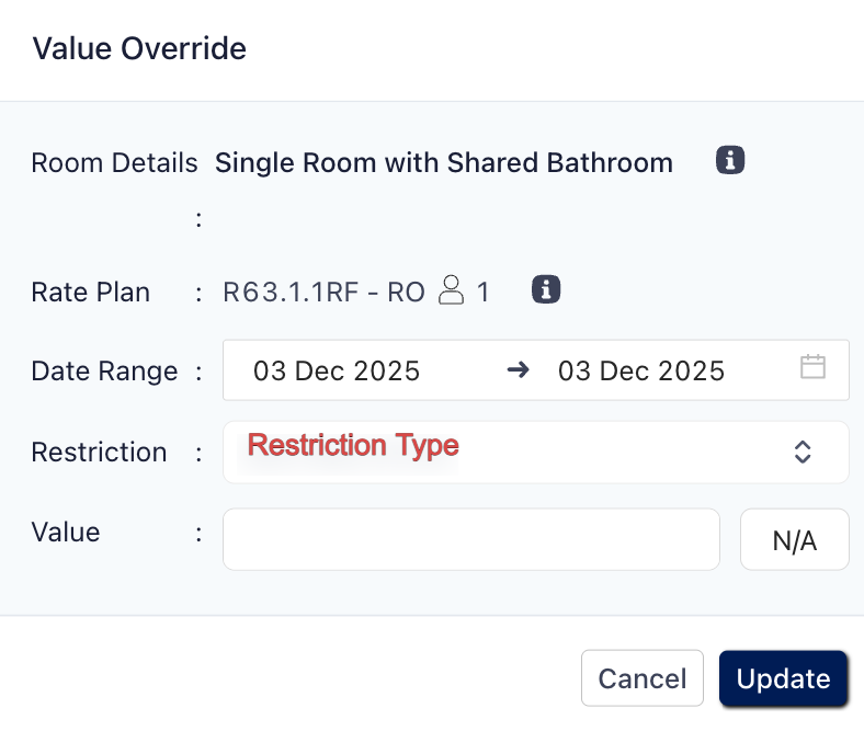 📝 Note: The format and layout of this popup are consistent across all restriction types, the only field that changes is the Restriction Type, based on the row you selected.